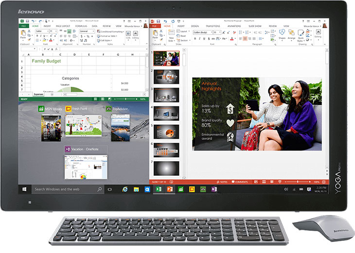 The Lenovo Yoga 900 Home is an All-in-One PC, which has a 27 inch of Full HD (1920 x 1080 pixels) multi-touch LED display. It is powered by Intel’s 5th Generation Core i7-5500U Processor, paired with 2 GB DDR3 NVIDIA GeForce 940A GPU and 8GB RAM. It comes in either HDD or SSD storage variant with up to 500 GB / 1 TB for HDD or up to 500 GB + 8GB / 1 TB + 8GB for SSD.